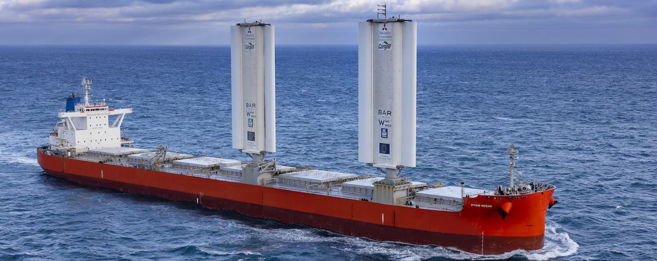 Captain Vaidya already knew the Pyxis Ocean was a unique ship. It was the first bulk carrier retrofitted with 37-meter-long (150 feet), airplane-style wings, called WindWings. Developed by BAR Technologies and Cargill in partnership with MC Shipping, the WindWings allow the ship to harness the power of wind.